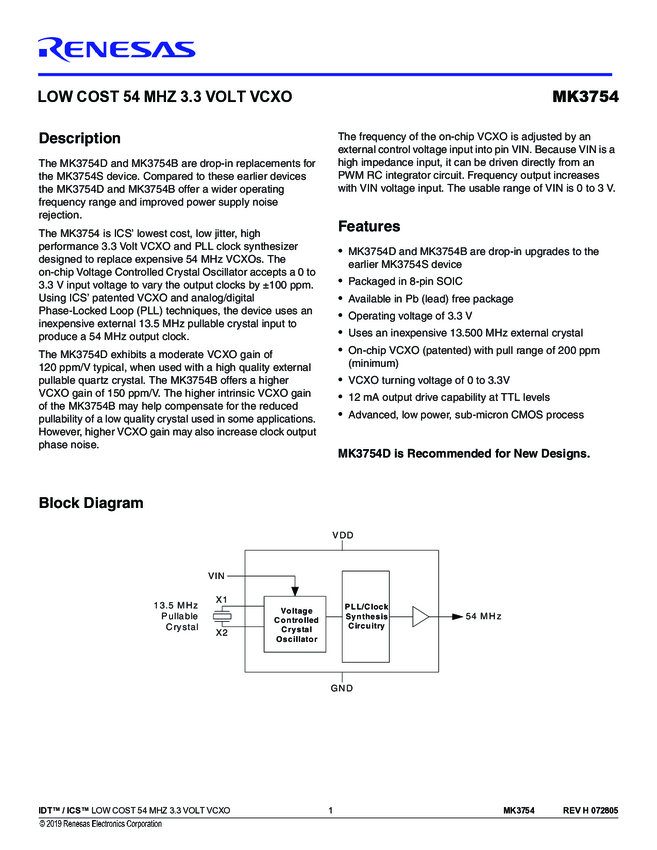 Low Cost 54 MHz 3.3 Volt VCXO