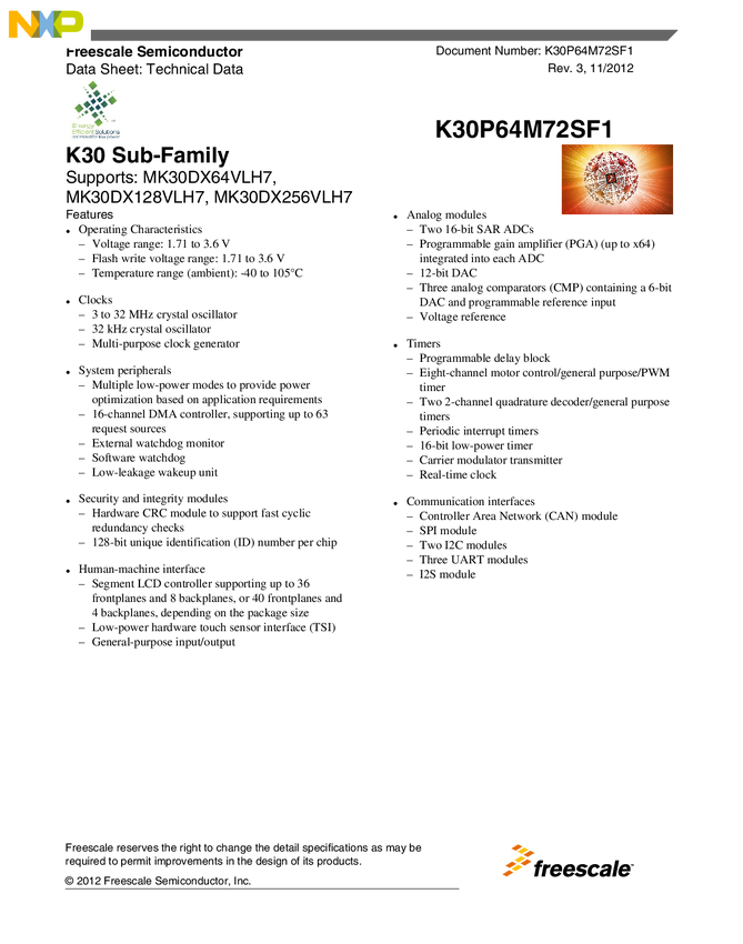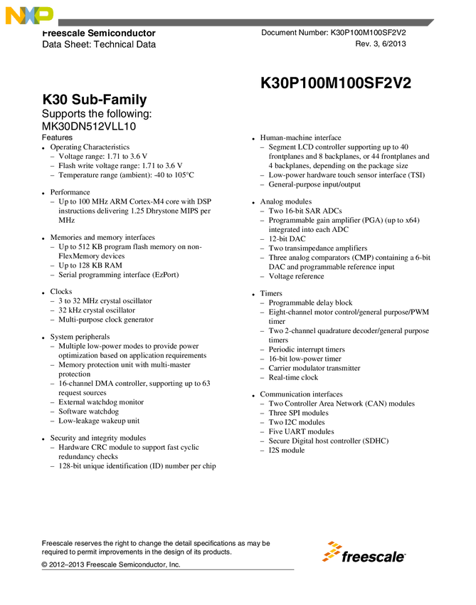 Kinetis K30-72 MHz, Mixed-Signal Integration Microcontrollers (MCUs) based on Arm<sup>&#174;</sup> Cortex<sup>&#174;</sup>-M4 Core