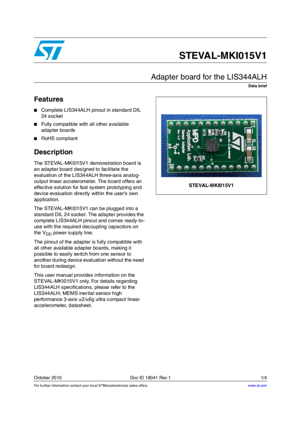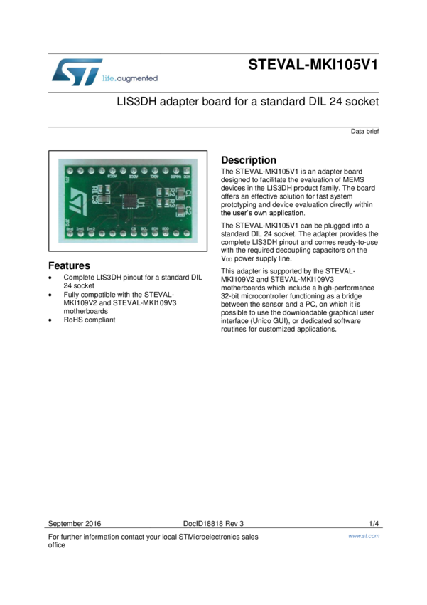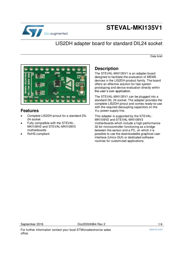 LIS2DH12 3-axis accelerometer adapter board for standard DIL 24 socket, compatible with STEVAL-MKI109V2