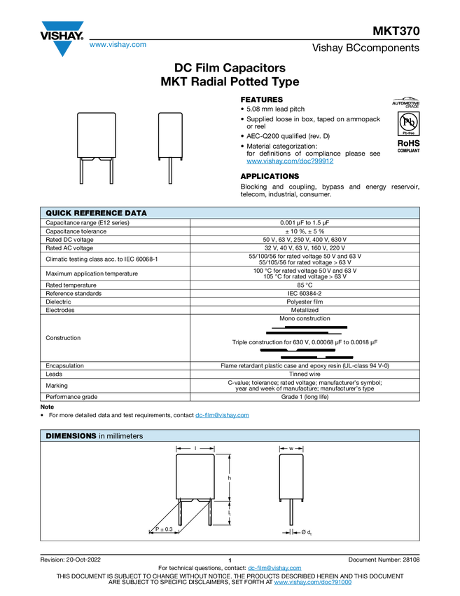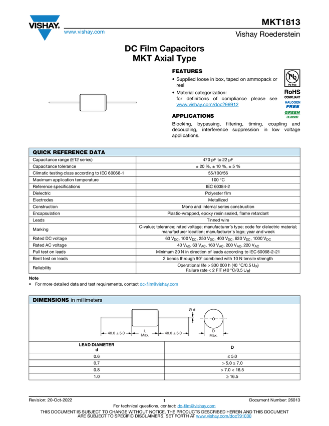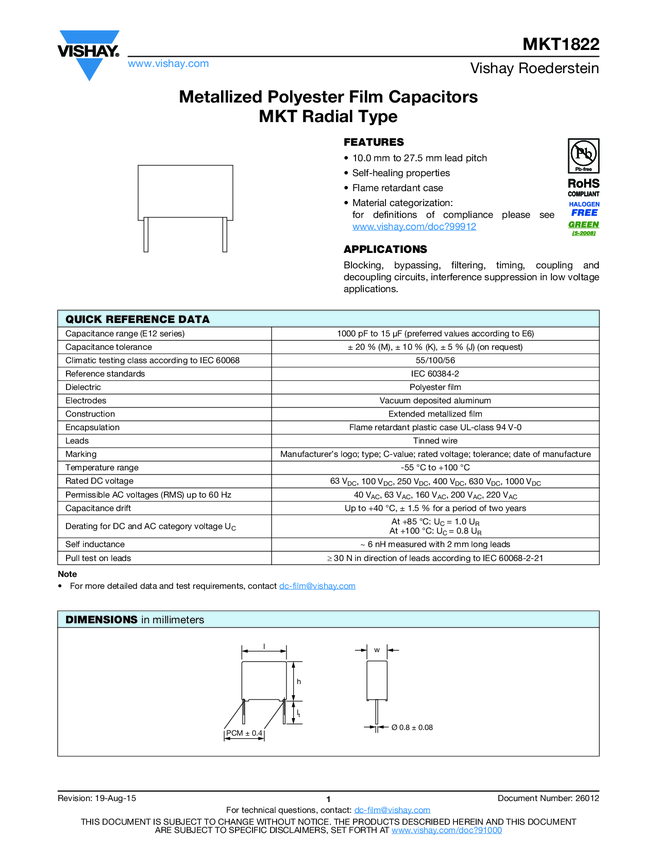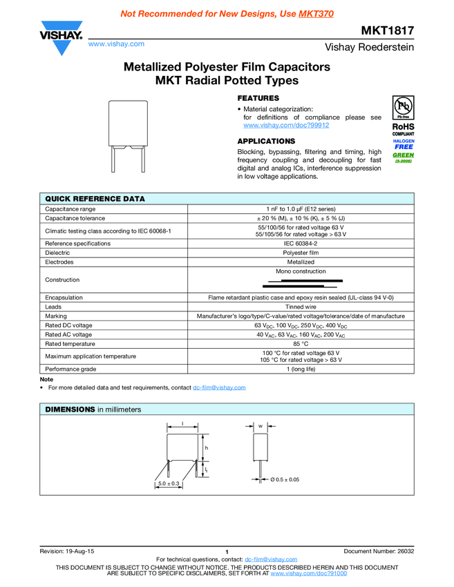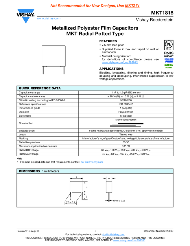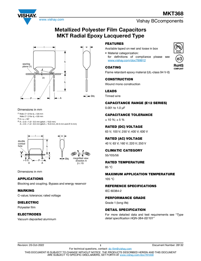 Metallized Polyester Film Capacitors MKT Radial Epoxy Lacquered Type