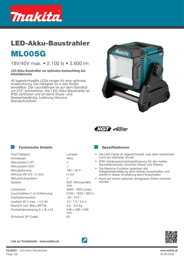 Reflektor budowlany Makita ML005G ML005G 3600 lm