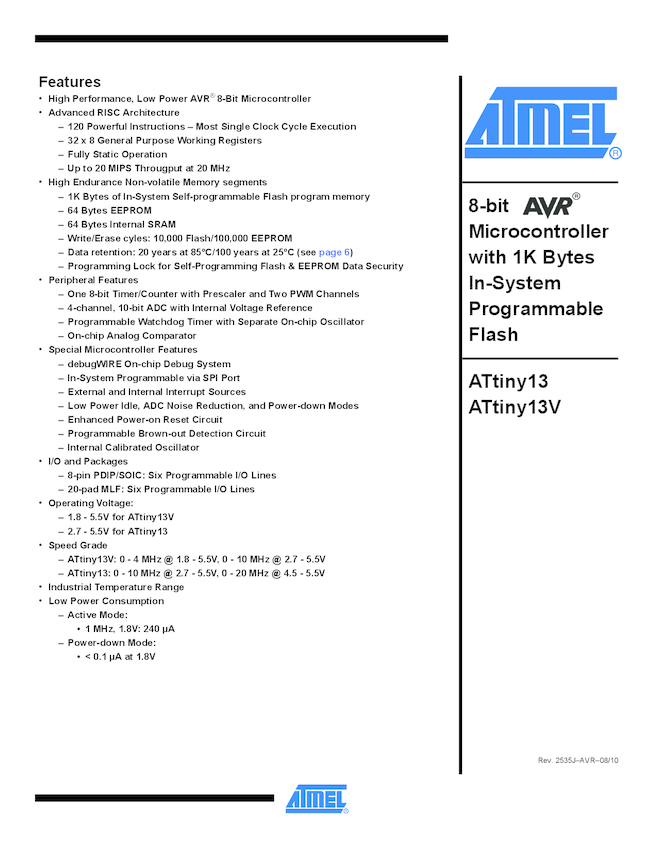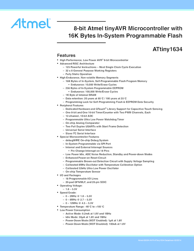 QFN/MLF20, 1k Flash, 64B SRAM, 64B EEPROM, Debug Wire