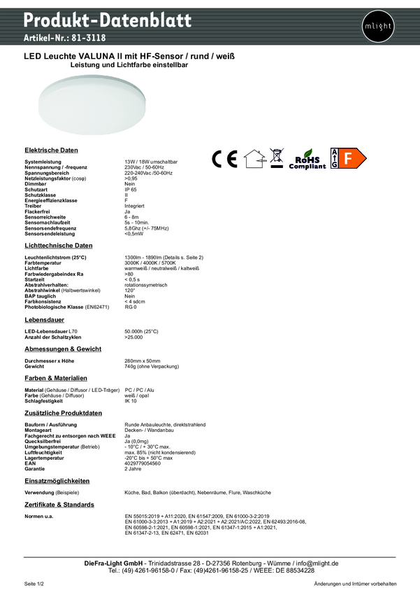 Lampa sufitowa LED z czujnikiem ruchu mlight Valuna II sensor rund weiß 81-3118 13 W, 18 W 1890 lm biały