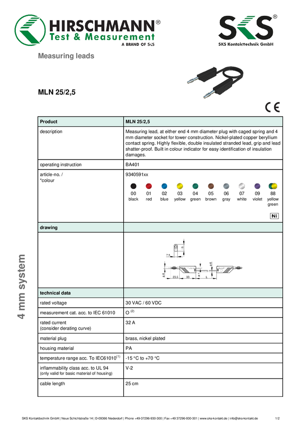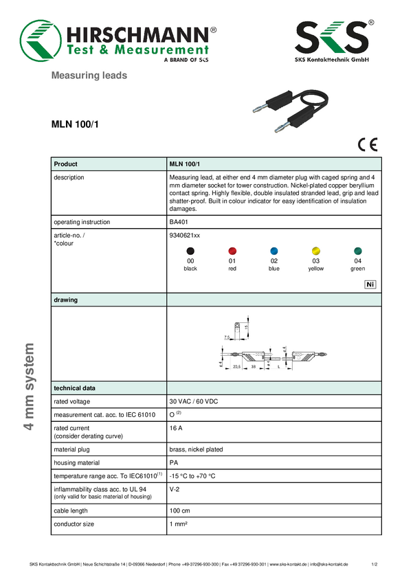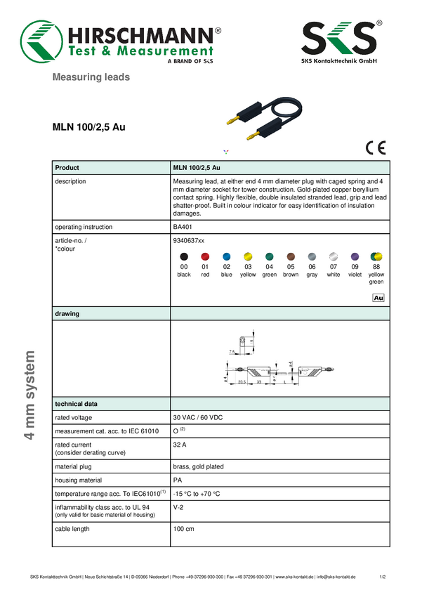 Przewód pomiarowy SKS Hirschmann CO MLN 100/1, 1.00 m
