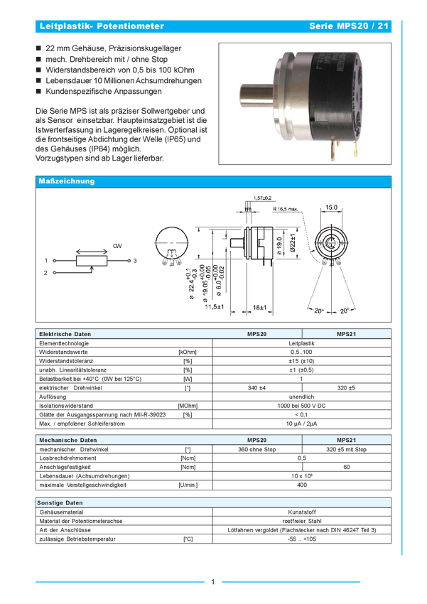 potencjometr prew.plastyk.; servo; lin.1% 1 obrotowy; średnica=7/8"=22mm; dł.=18mm; ośka=6mm trwałość=10 mln.obr.; moc 1W; 360 stopni bez stopu