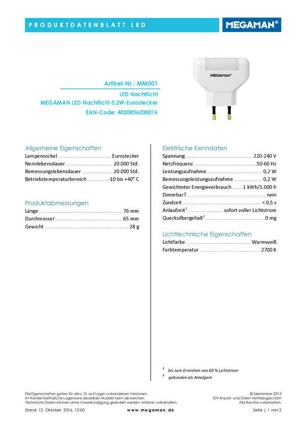 Lampka nocna LED Megaman MM001, LED wbudowany na stałe, 2700 K, (S x W x G) 5.8 x 7.6 x 1.6 cm, biały