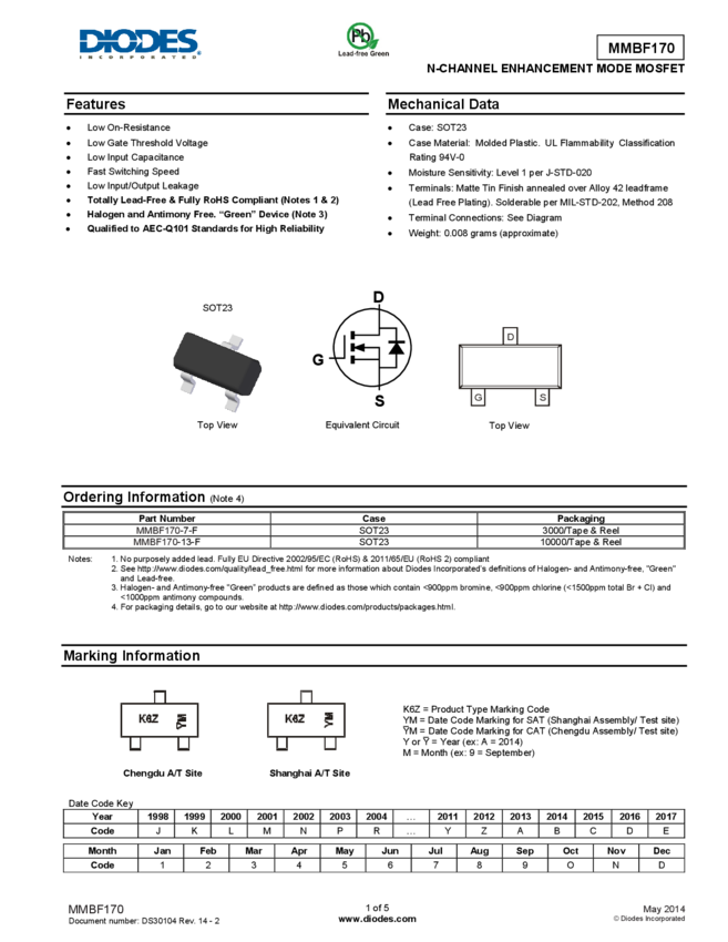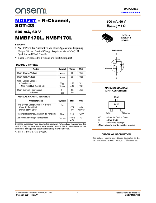 Automotive Power MOSFET, 60V, 500mA, 5 Ohm, Single N-Channel, SOT-23, Logic Level.