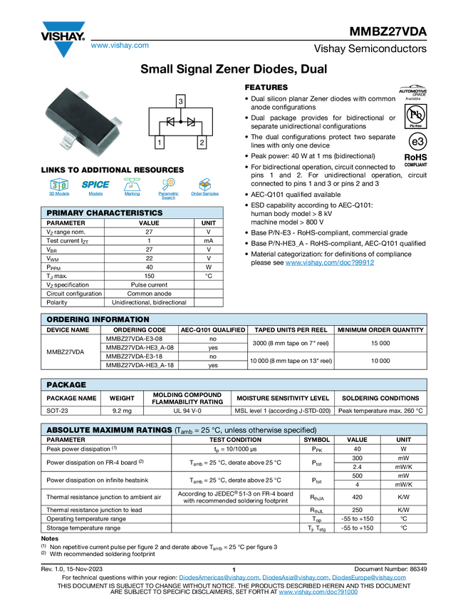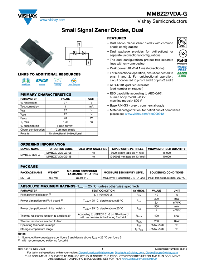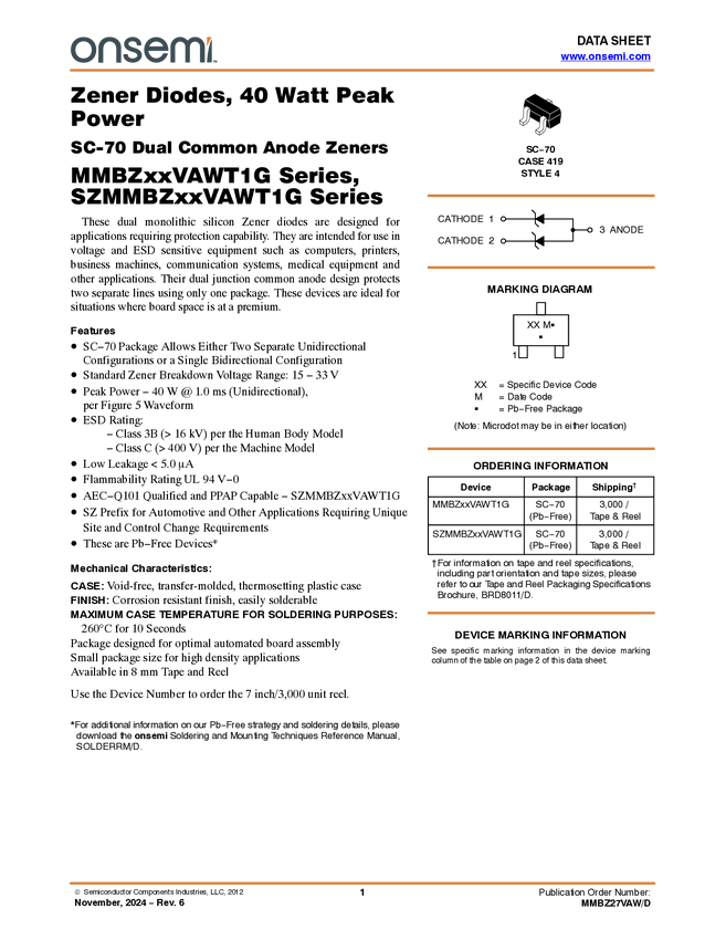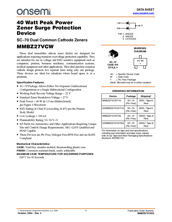 Zener Diode Protection, Common Cathode, 40 Watt Peak Power