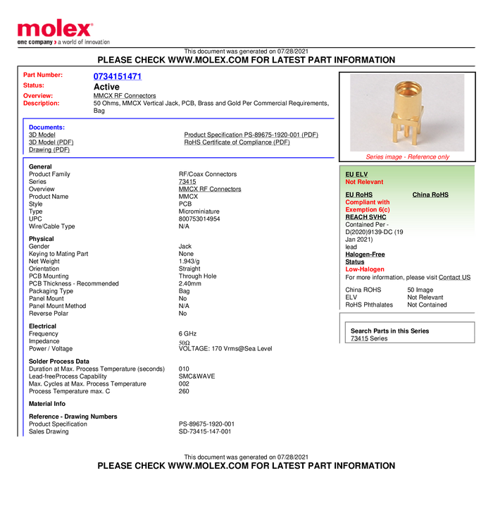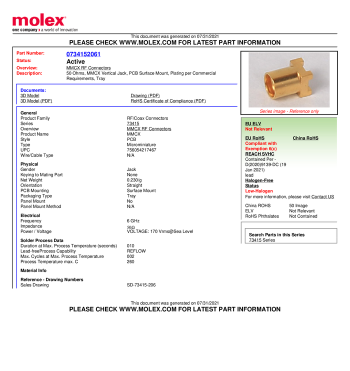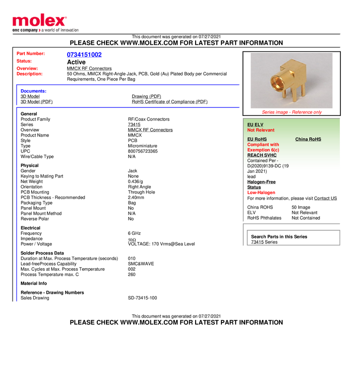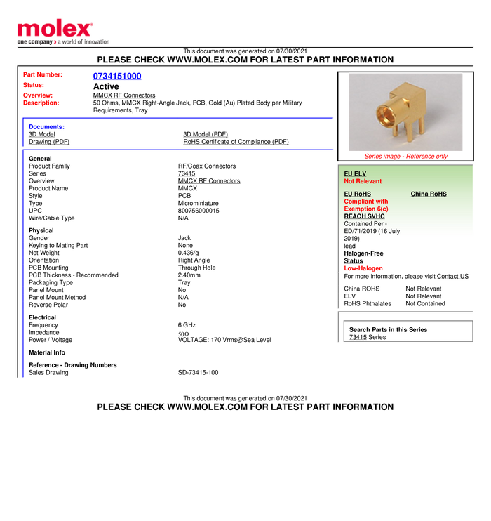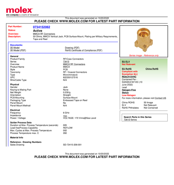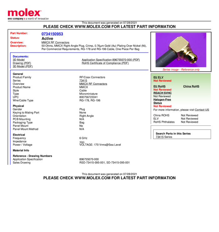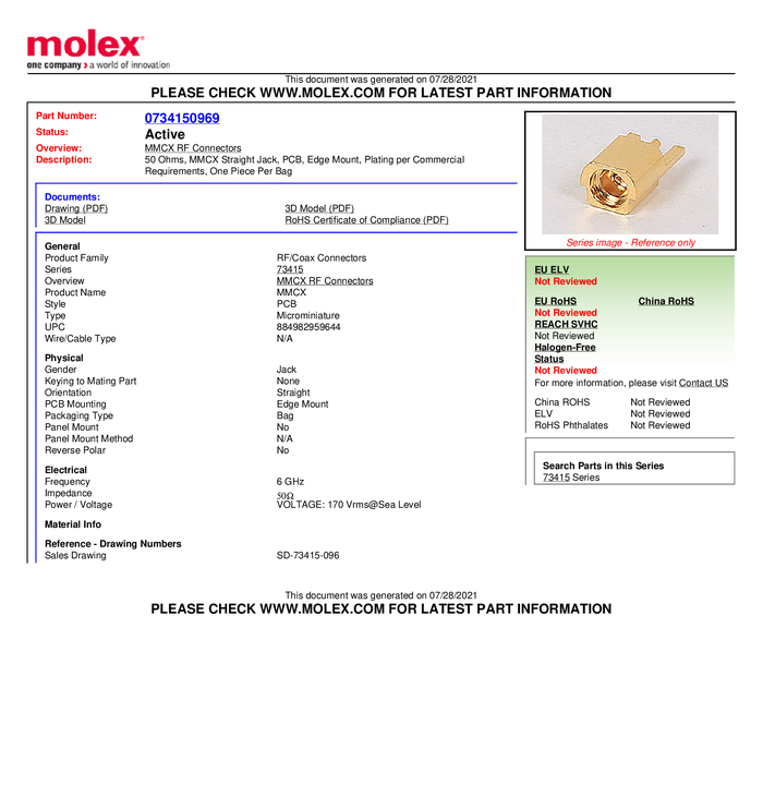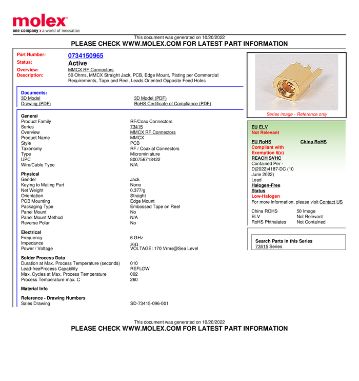 Złącze MMCX Molex Molex MOL DataCom & Specialty 734150963-1500 gniazdo 50 Ω 1500 szt.