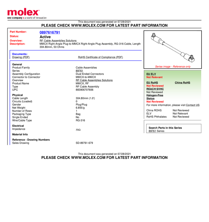 Złącze MMCX Molex Molex MOL DataCom & Specialty 897616791 złącze męskie 50 Ω 1 szt.
