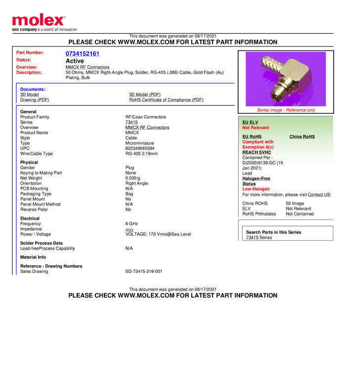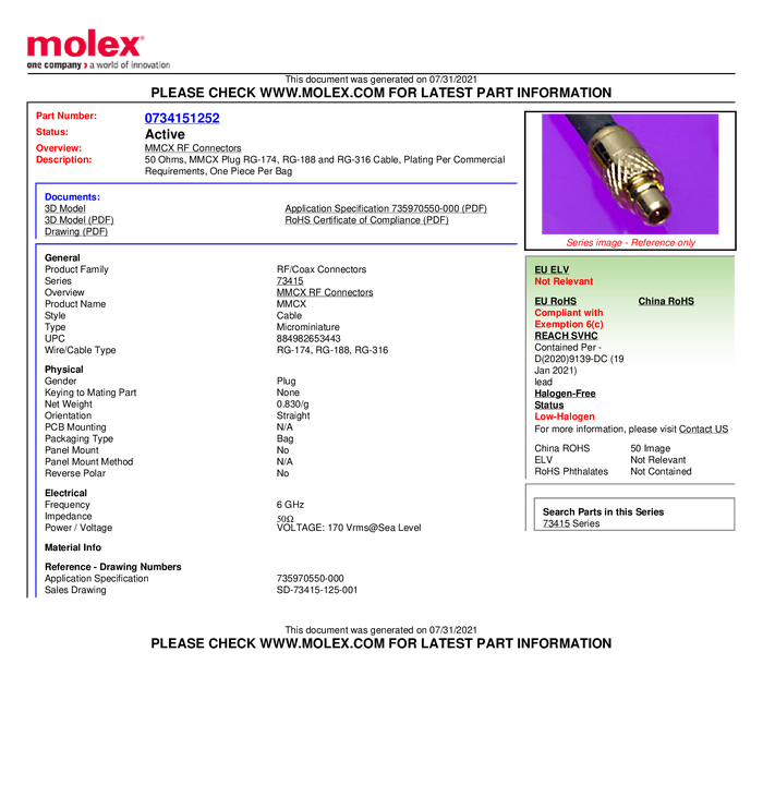 Złącze MMCX Molex Molex MOL DataCom & Specialty 734152161 złącze męskie 50 Ω 1 szt.