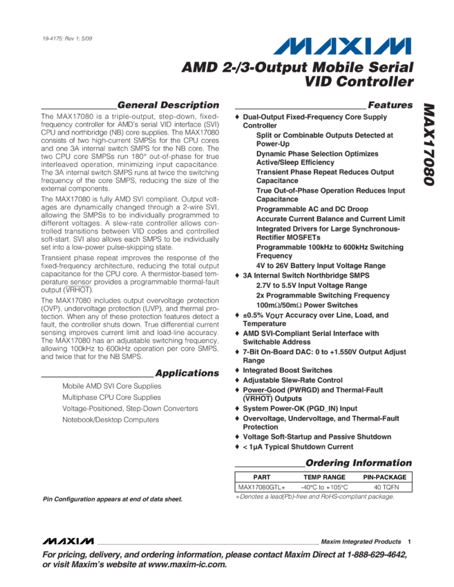 MAX17009 AMD Mobile Serial VID Dual-Phase Fixed-Frequency Controller