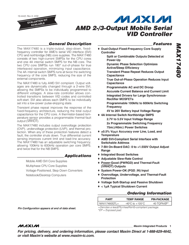 MAX17480 AMD 2-/3-Output Mobile Serial VID Controller