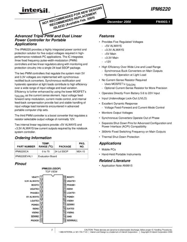 Multiphase PWM Regulator for IMVP-6+ Mobile CPUs