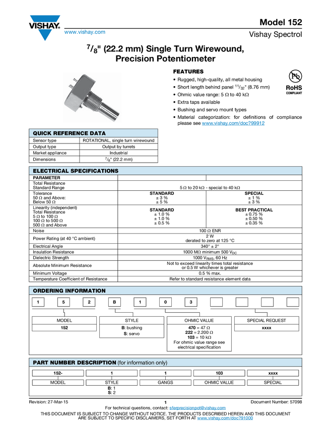 7/8" (22.2 mm) Precision Industrial Potentiometer, Bushing And Servo Mount Versions, Conductive Plastic