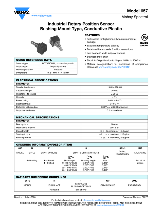Industrial Rotary Position Sensor, Bushing Mount Type, Conductive Plastic