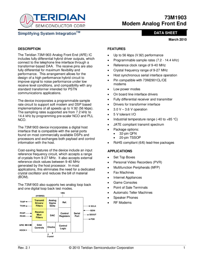 73M1903 Modem Analog Front-End