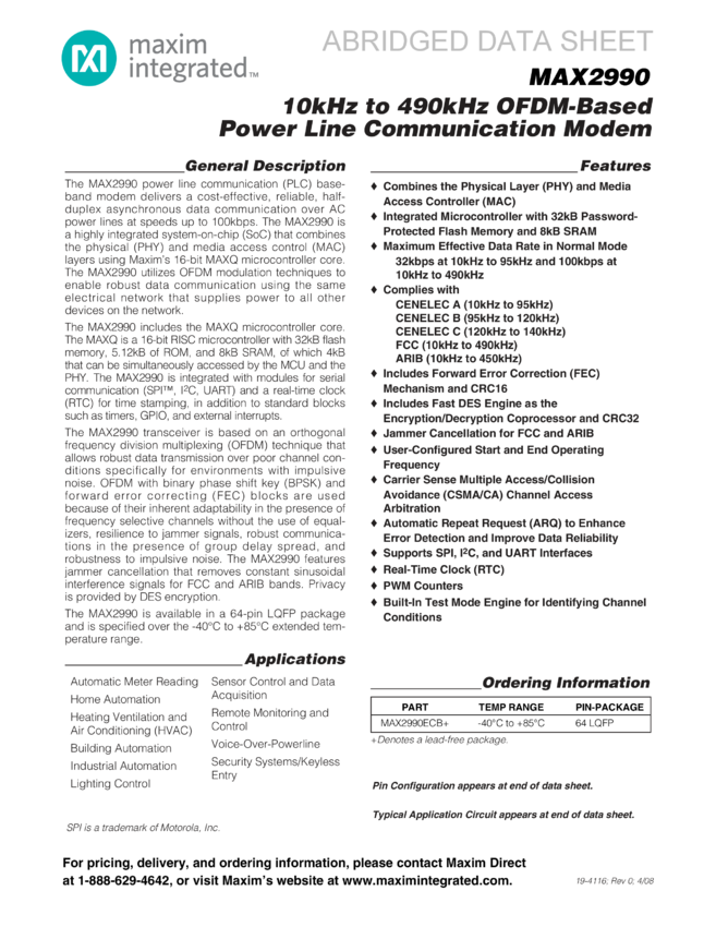 MAX2990 10kHz to 490kHz OFDM-Based Power Line Communications Modem