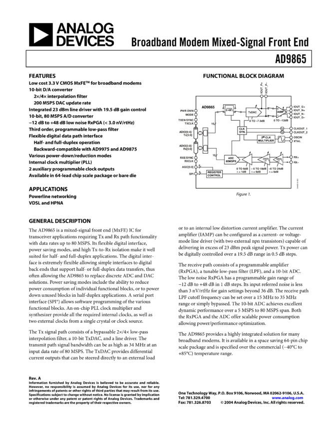 AD9865: 10-Bit Broadband Modem Mixed Signal Front End (MxFE®)