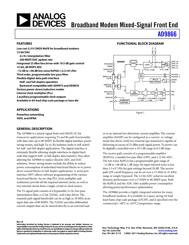 AD9866: 12-Bit Broadband Modem Mixed Signal Front End (MxFE®)