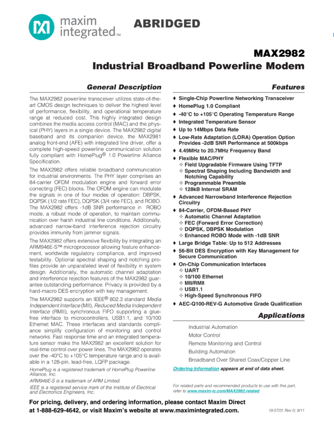 MAX2982 Industrial Broadband Powerline Modem