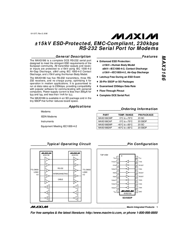 ±15kV ESD-Protected, EMC Compliant, 230kbps RS-232 Serial Port for Modems