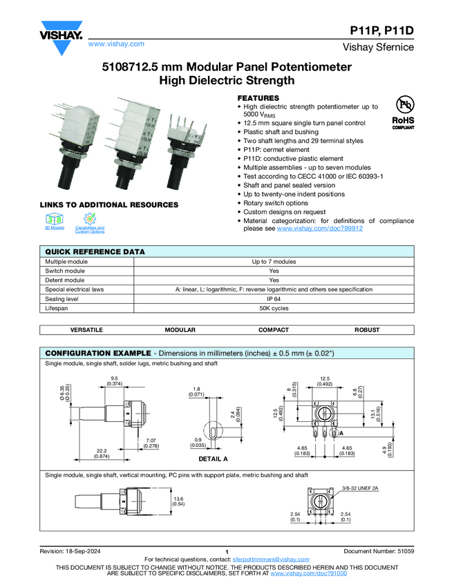 12.5 mm Modular Panel Potentiometer Cermet (P11S) or Conductive Plastic Elements (P11A)