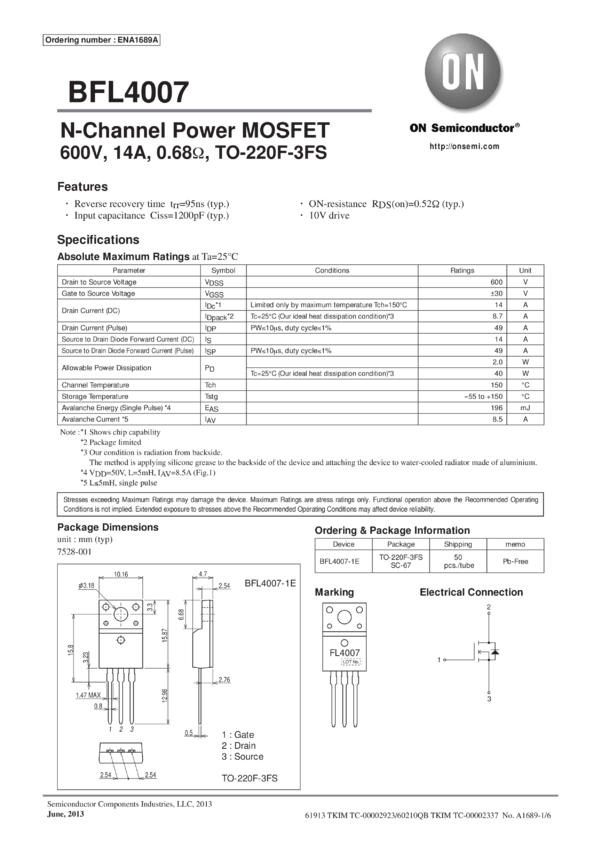 Power MOSFET 600V 14A 680 mOhm Single N-Channel TO-220F-3FS