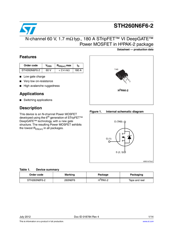 N-channel 60 V, 1.7 mOhm typ., 180 A STripFET(TM) VI DeepGATE(TM) Power MOSFET in H2PAK-2 package