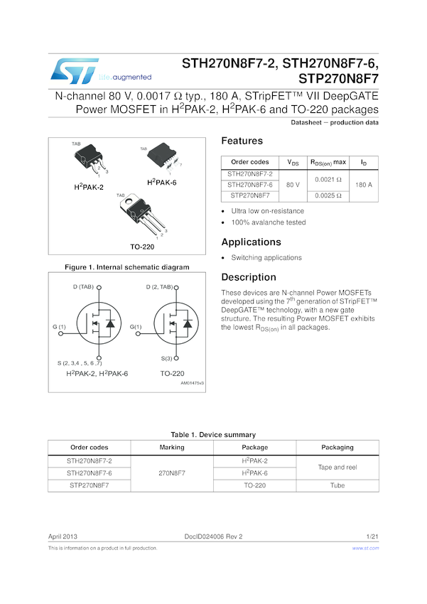N-channel 80 V, 1.7 mOhm typ., 180 A STripFET(TM) VII DeepGATE(TM) Power MOSFET in H2PAK-2 package