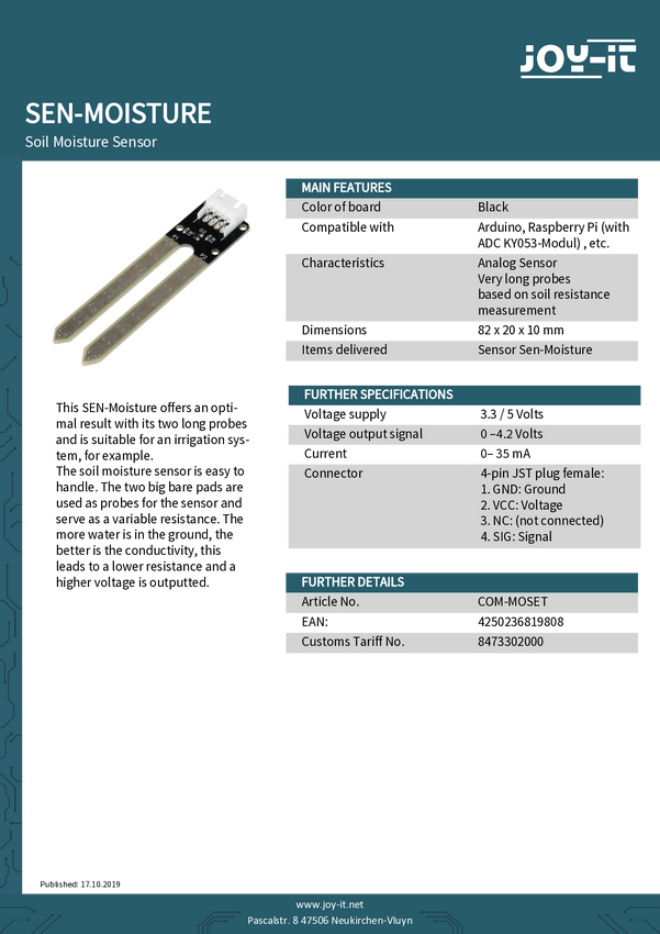 Moduł czujnika Joy-it sen-Moisture Zestaw czujnika 1 szt.