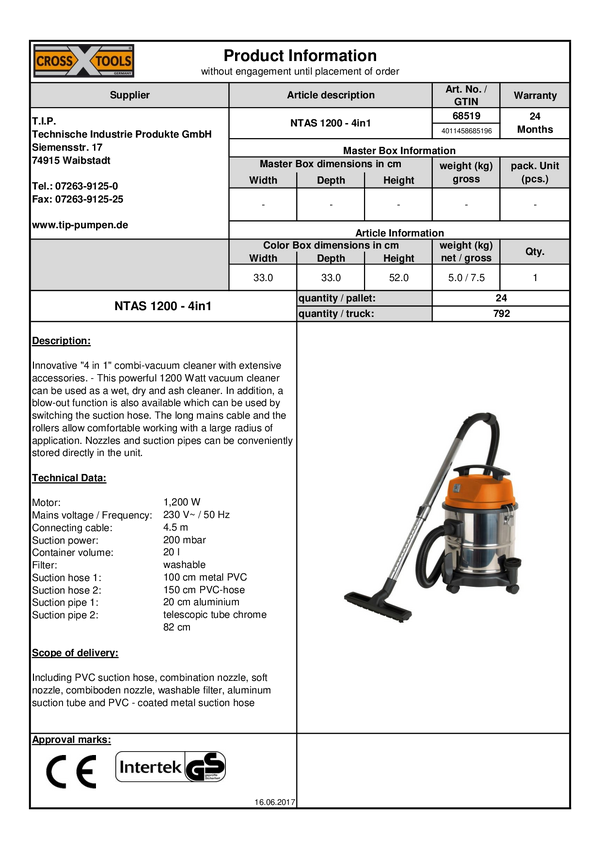 Odkurzacz do pracy na sucho i mokro CrossTools NTAS 1200 I - 4 in 1 68519 20 l 1 szt.