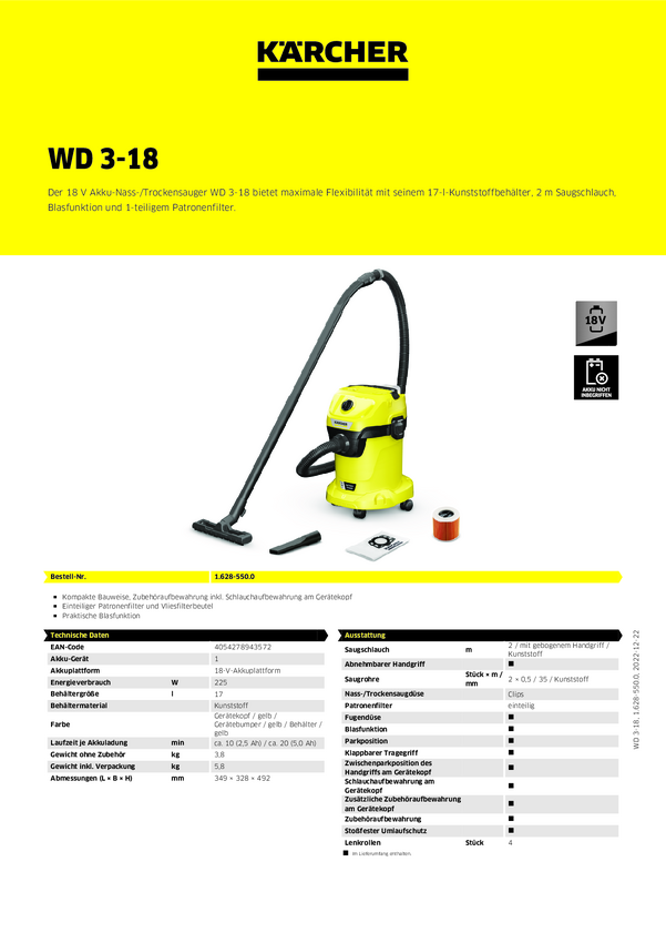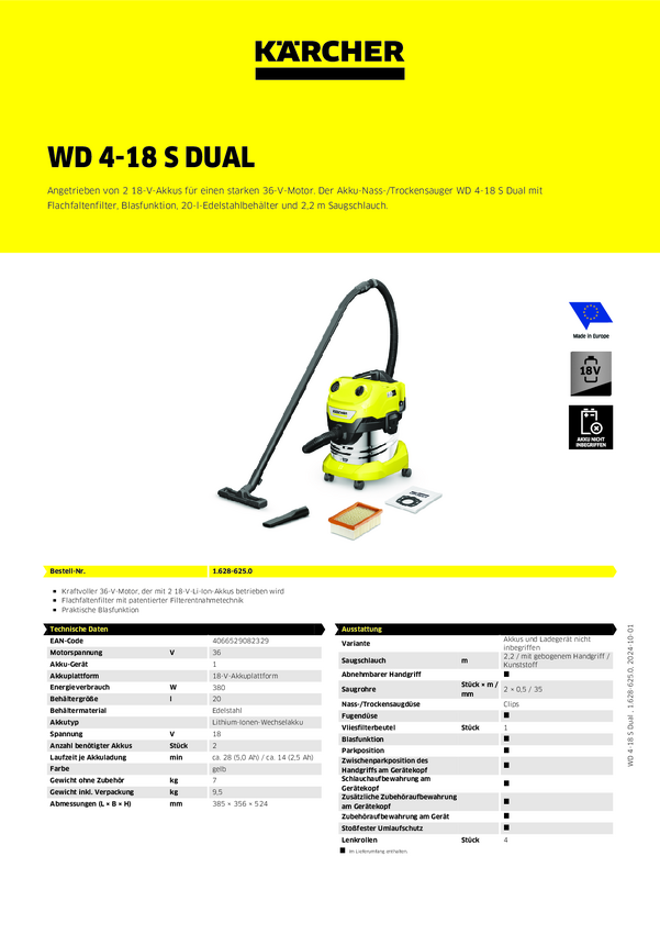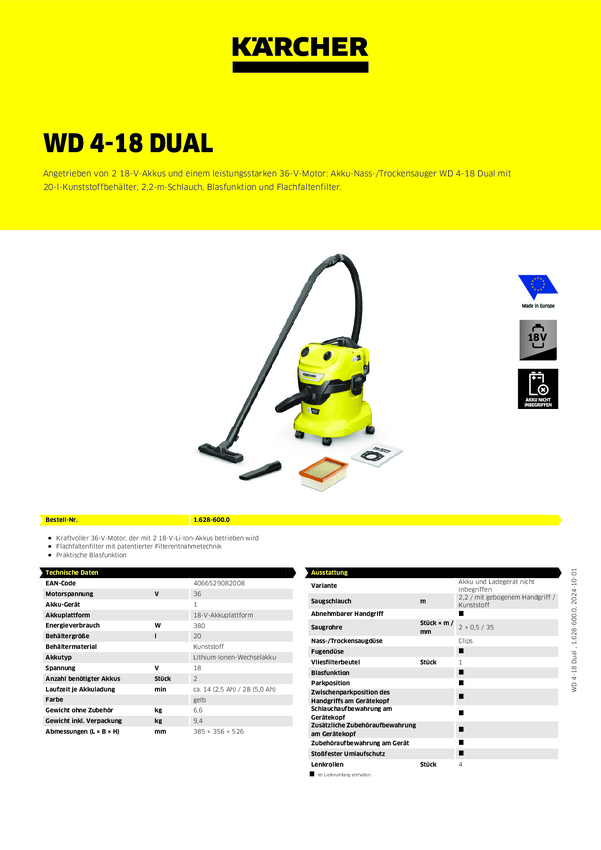 Bezprzewodowy odkurzacz do pracy na sucho i mokro Kärcher Home & Garden WD 4-18 Dual V-20/22 1.628-600.0 20 l 1 szt.