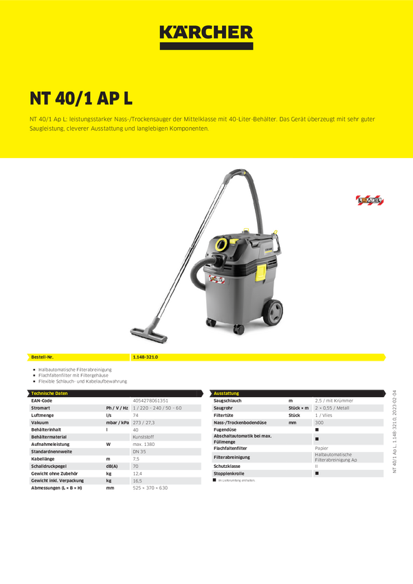 Odkurzacz do pracy na sucho i mokro Kärcher Professional NT 40/1 Ap L *EU 1.148-321.0 74 l/s 40 l 1 szt.