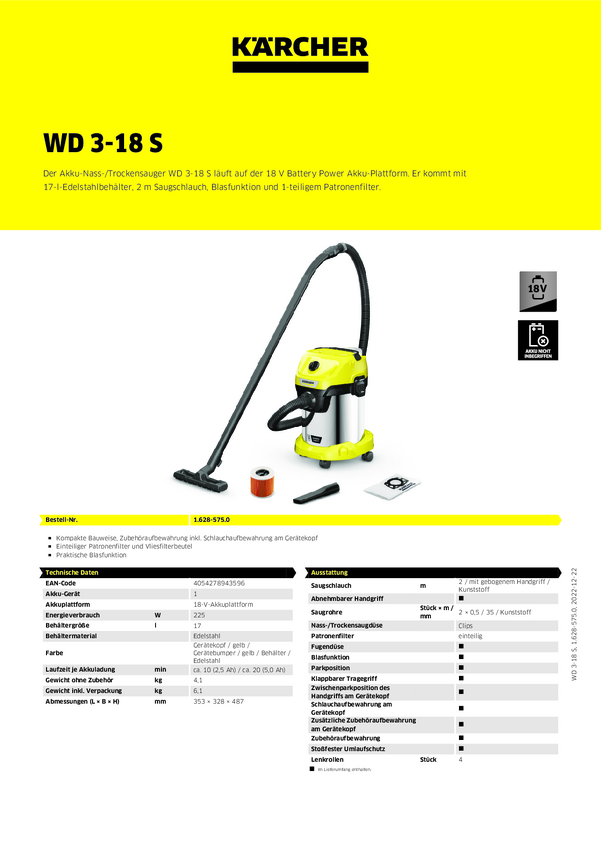 Bezprzewodowy odkurzacz do pracy na sucho i mokro Kärcher Home & Garden WD 4-18 S Dual V-20/22 1.628-625.0 20 l 1 szt.