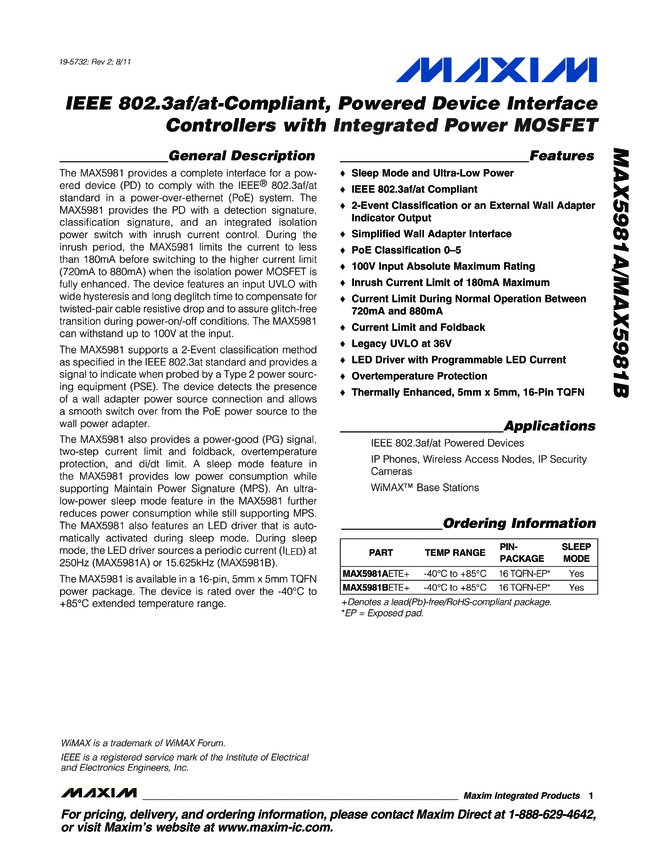 MAX5981A, MAX5981B IEEE 802.3af/at-Compliant, Powered Device Interface Controllers with Integrated Power MOSFET