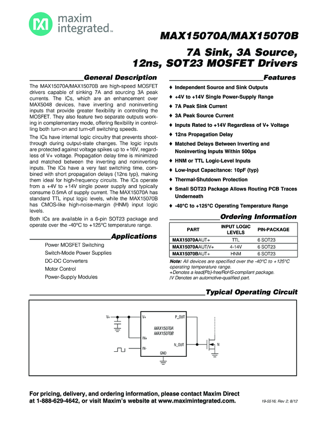 MAX15070A, MAX15070B 7A Sink, 3A Source, 12ns, SOT23 MOSFET Drivers