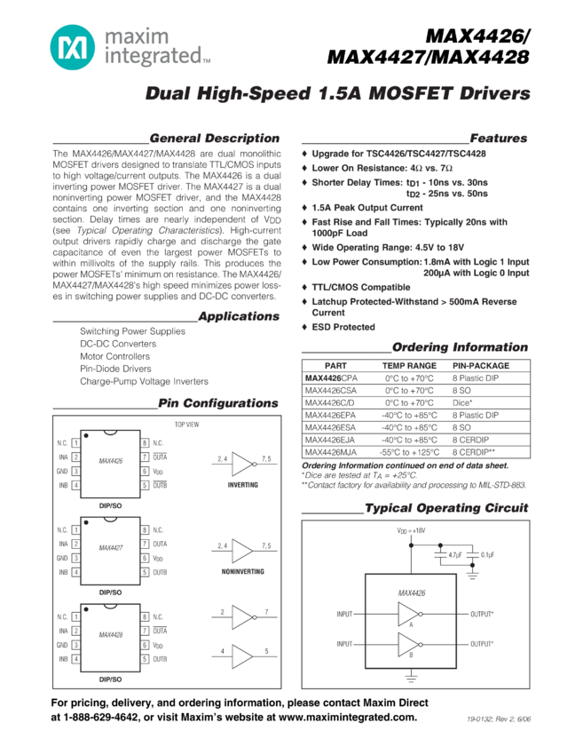 MAX4426, MAX4427, MAX4428 Dual High-Speed, 1.5A MOSFET Drivers