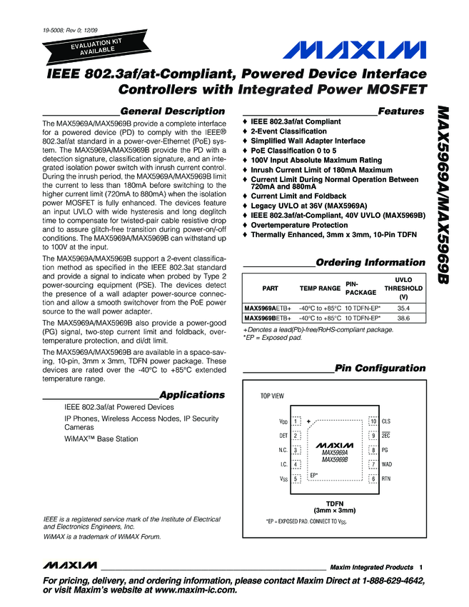 MAX5969A, MAX5969B IEEE 802.3af/at-Compliant, Powered Device Interface Controllers with Integrated Power MOSFET