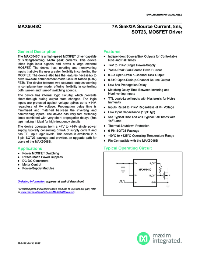 MAX5048C 7A Sink/3A Source Current, 8ns, SOT23, MOSFET Driver