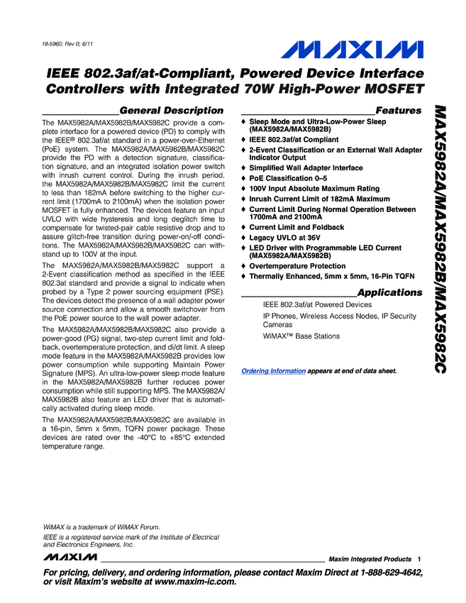 MAX5982A, MAX5982B, MAX5982C IEEE 802.3af/at-Compliant, Powered Device Interface Controllers with Integrated 70W High-Power MOSFET