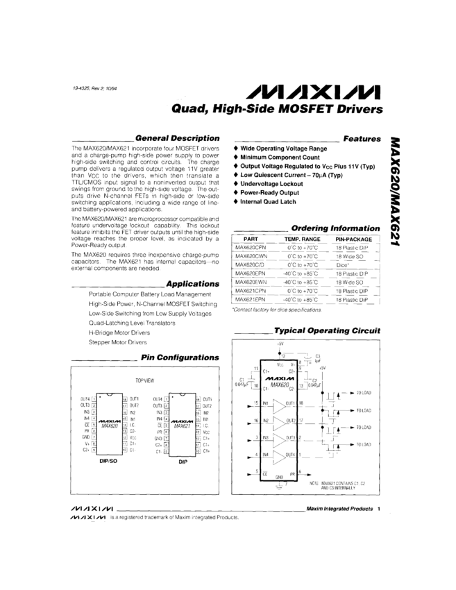 MAX620, MAX621 Quad, High-Side MOSFET Driver