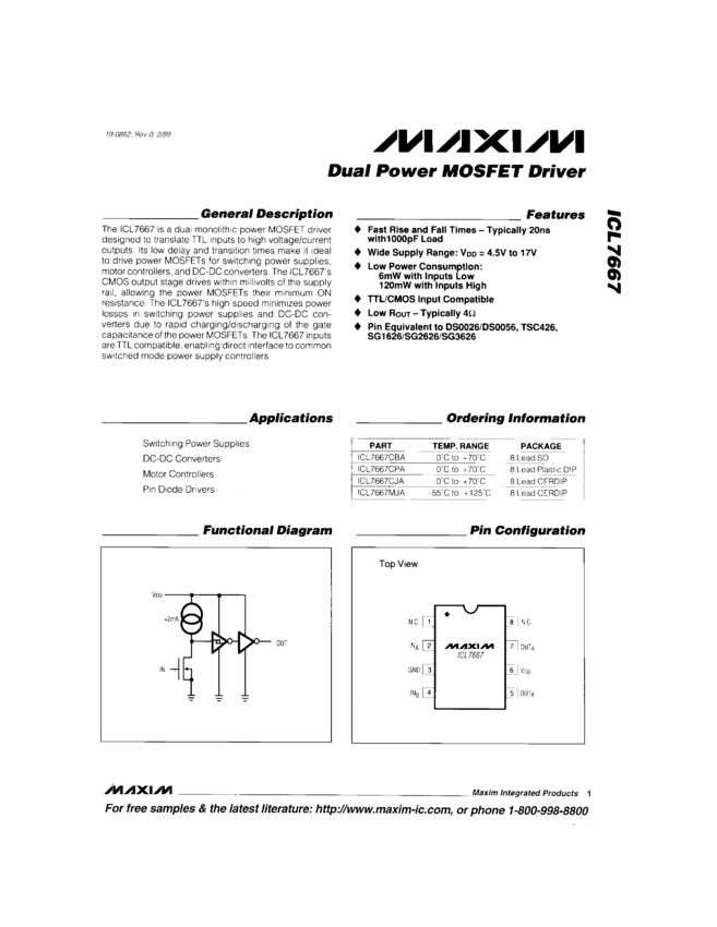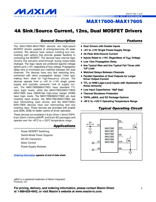 MAX17600, MAX17601, MAX17602, MAX17603, MAX17604, MAX17605 4A Sink/Source Current, 12ns, Dual MOSFET Drivers