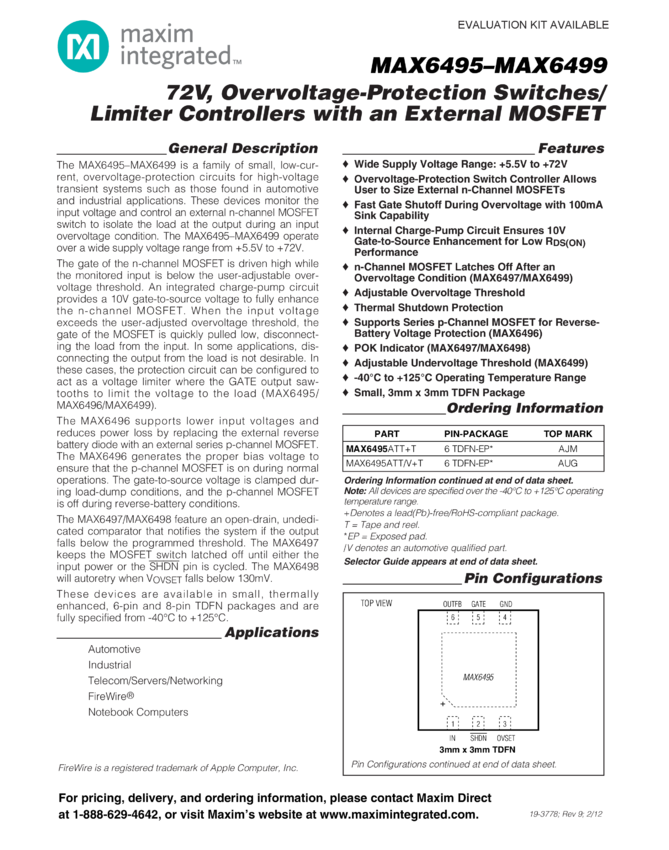 MAX6495, MAX6496, MAX6497, MAX6498, MAX6499 72V, Overvoltage-Protection Switches/Limiter Controllers with an External MOSFET