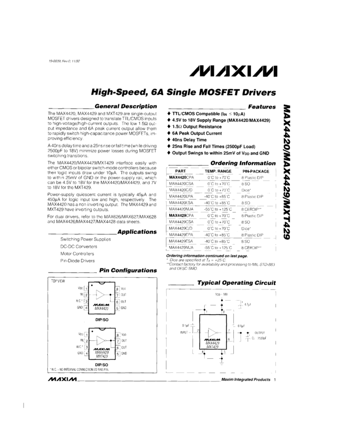 MAX4420, MAX4429, MXT429 High-Speed, 6A MOSFET Driver (Noninverting)