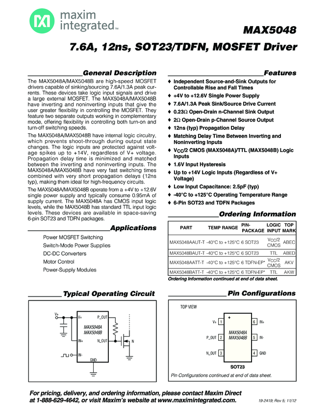 MAX5048 7.6A, 12ns, SOT23/TDFN MOSFET Driver