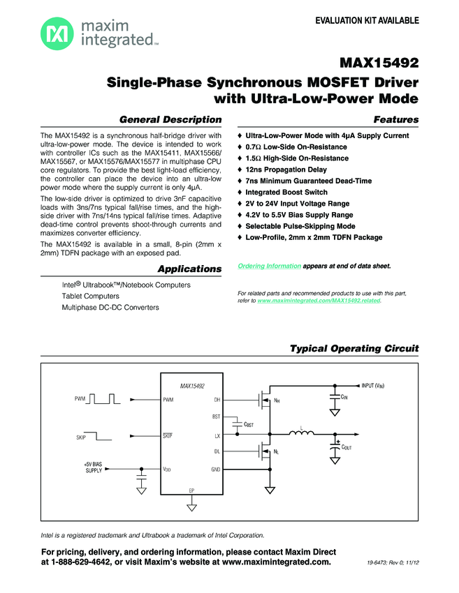 MAX15492 Single-Phase Synchronous MOSFET Driver with Ultra-Low-Power Standby