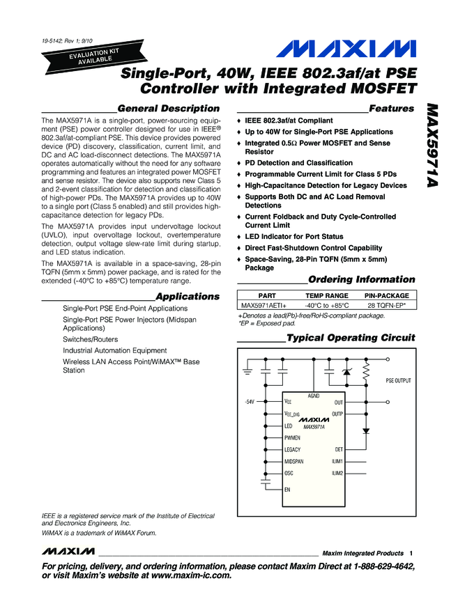 MAX5971A Single-Port, 40W, IEEE 802.3af/at PSE Controller with Integrated MOSFET
