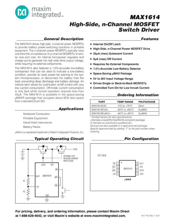 MAX1614 High-Side, n-Channel MOSFET Switch Driver