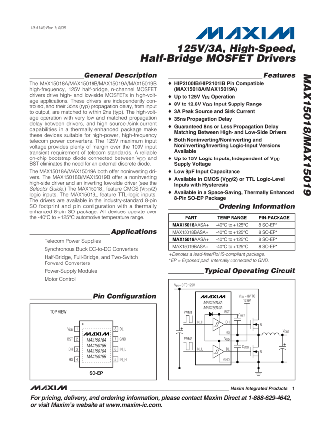 MAX15018, MAX15019 125V/3A, High-Speed, Half-Bridge MOSFET Drivers